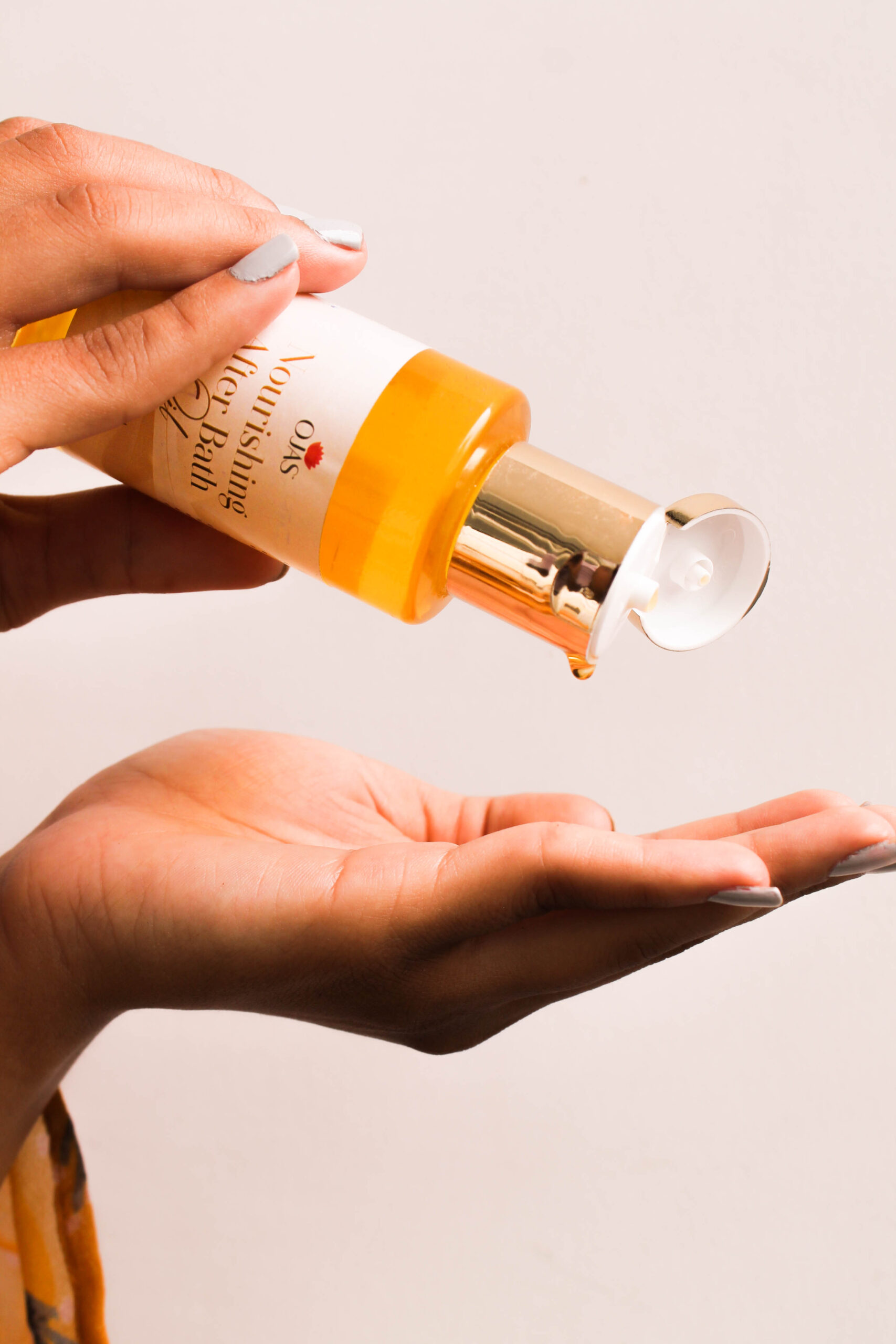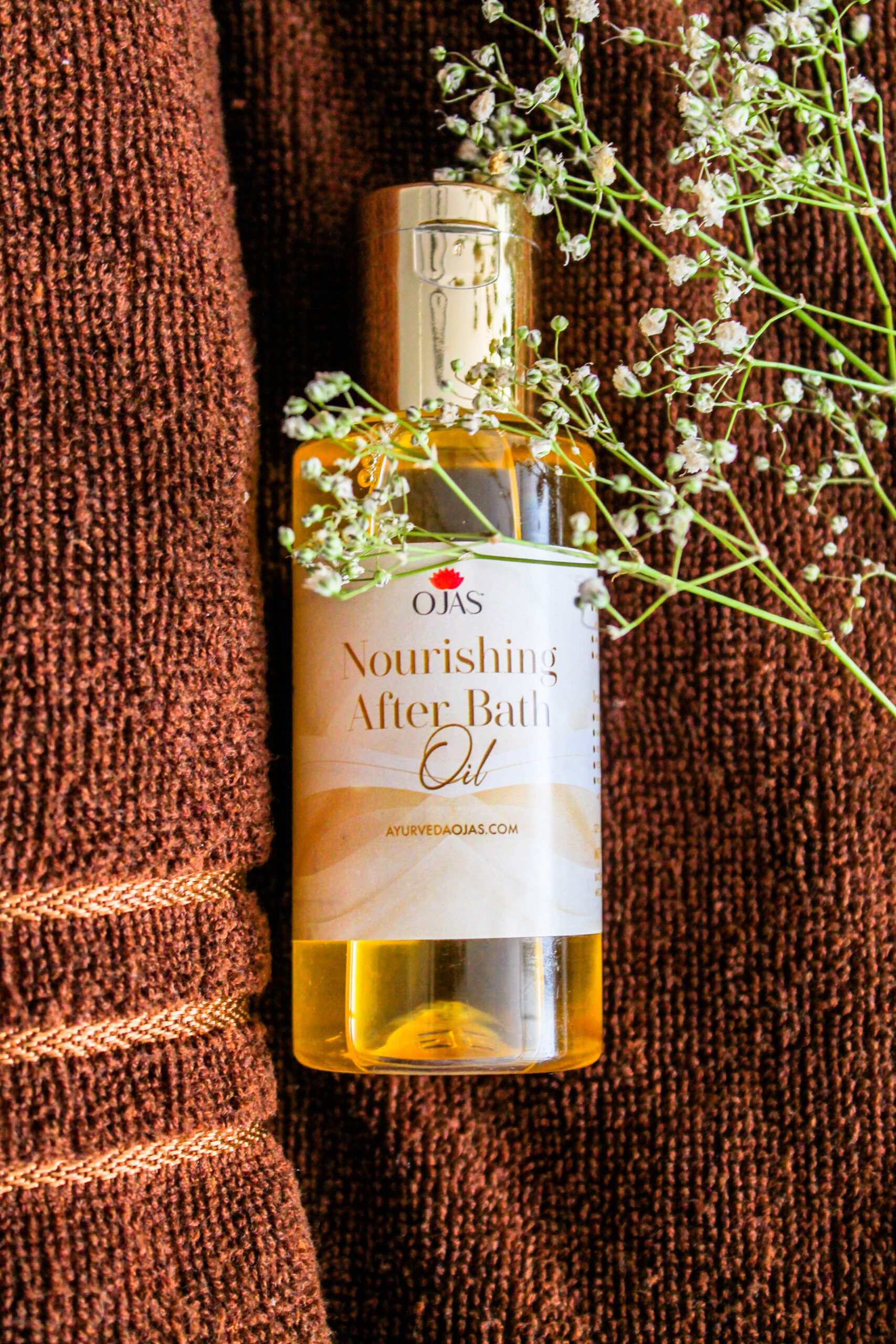 Take ample amount of Ojas nourishingAfter bath oil| Apply all over the damp body after shower| Massage the oil for 5-10 mins, till it gets absorbed.