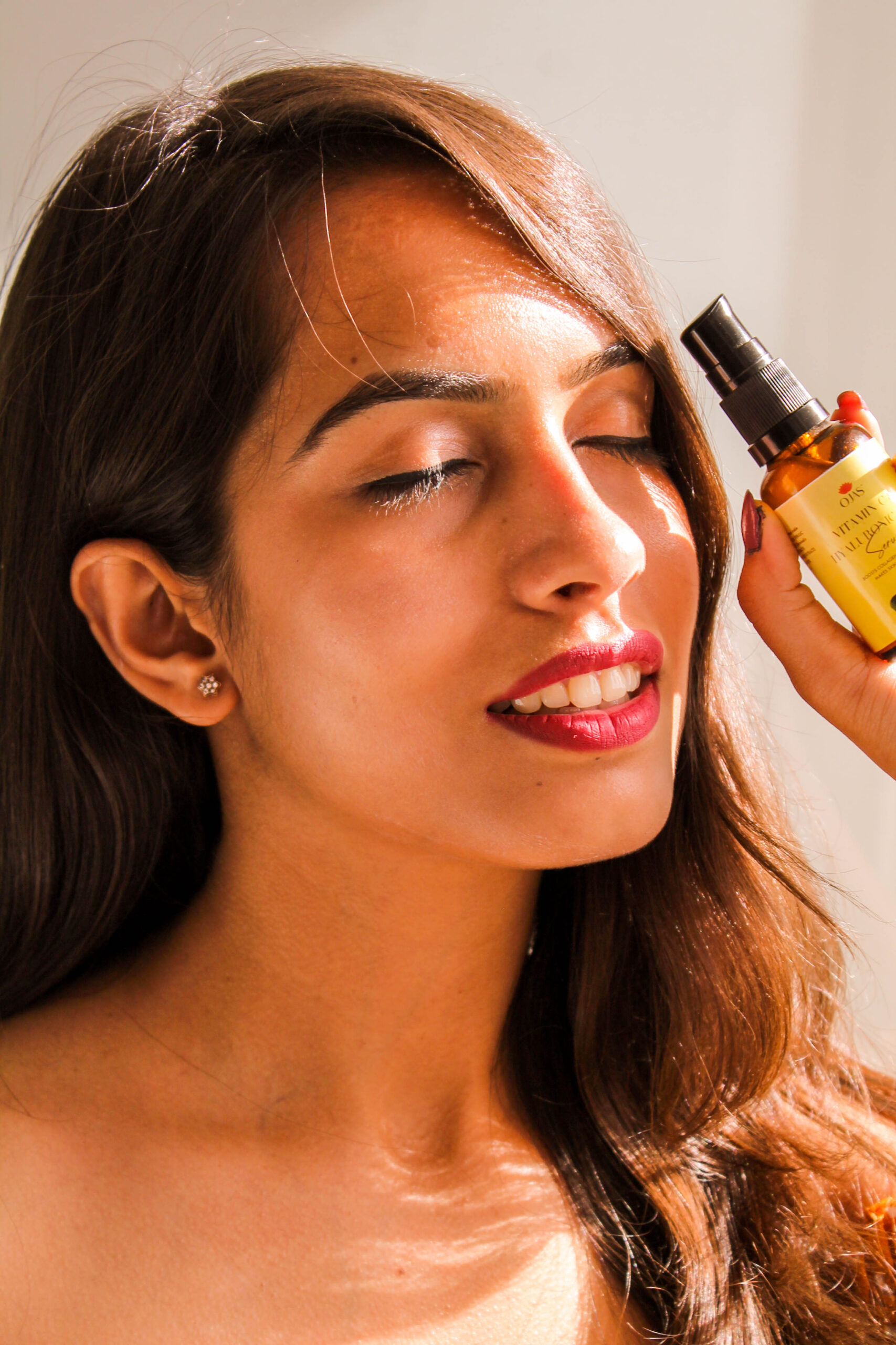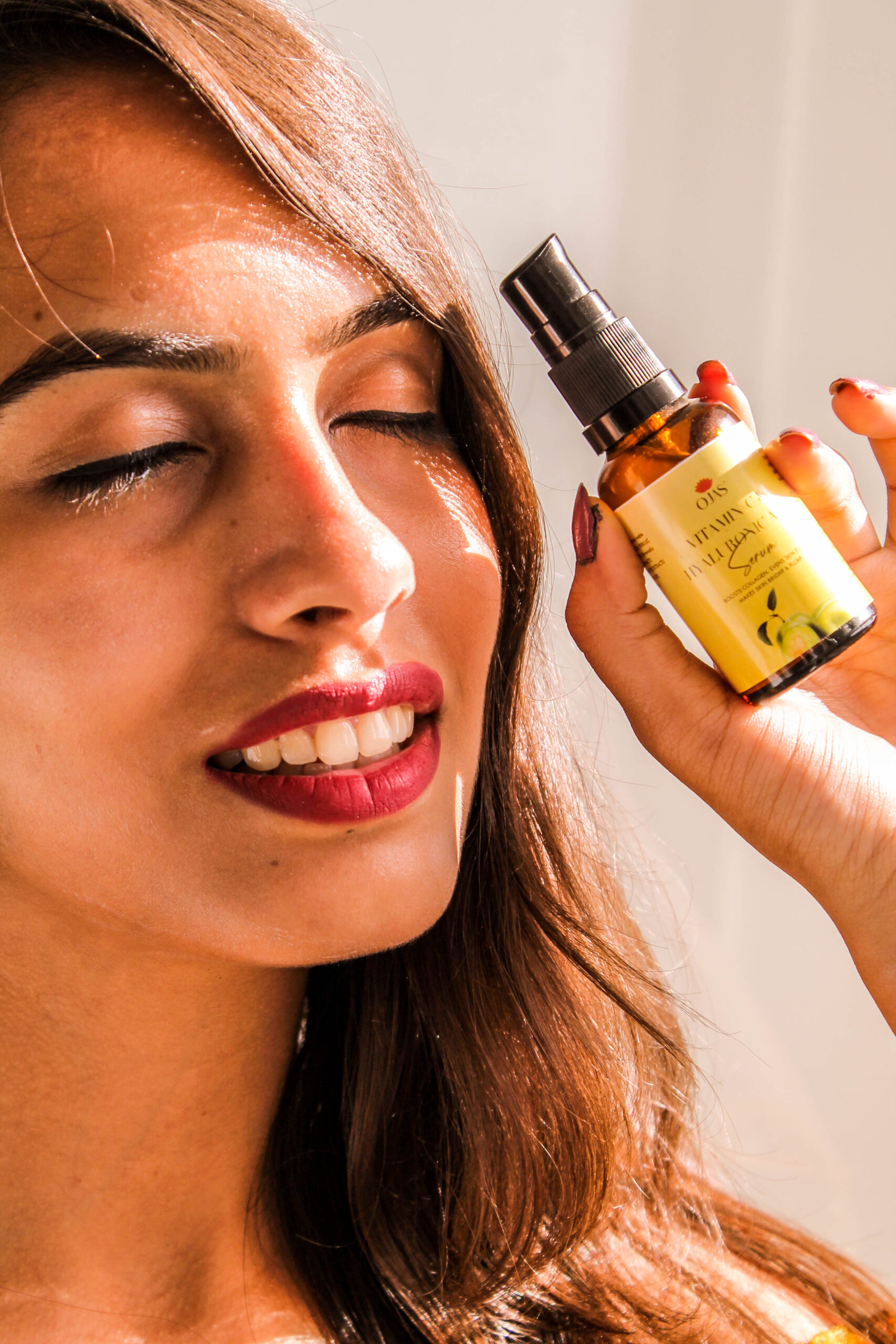 Wash your face with gentle cleanser & pat dry |Take few drops of Ojas Vitamin-c &Hyaluronic Acid & apply across the faceand neck| massage it till it gets absorbed